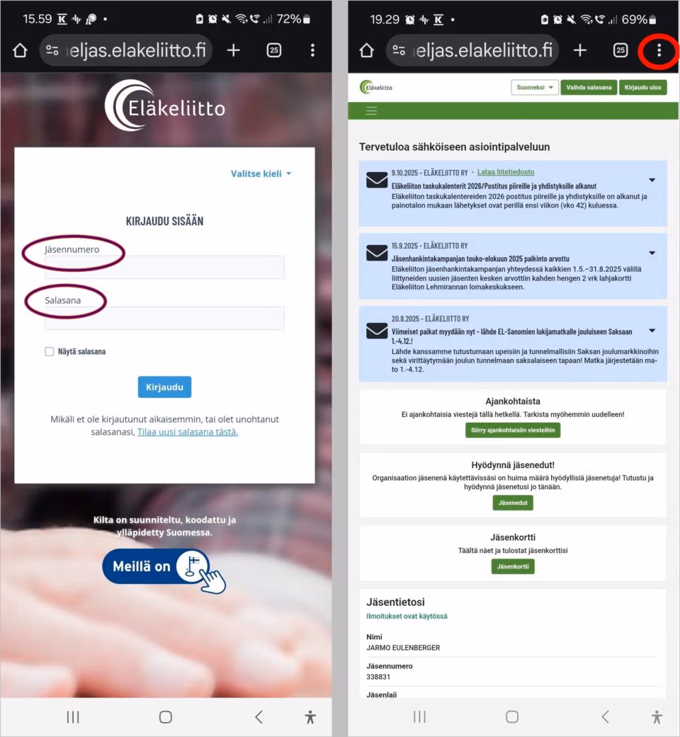 Avaa puhelimen/tabletin nettiselaimessa OmaEljas-sivu https://omaeljas.elakeliitto.fi ja kirjaudu jäsennumerolla ja luomallasi salasanalla. Kun OmaEljas on avautunut mobililaitteen näyttöön, valitse näytön oikeasta yläkulmasta 3-pistettä