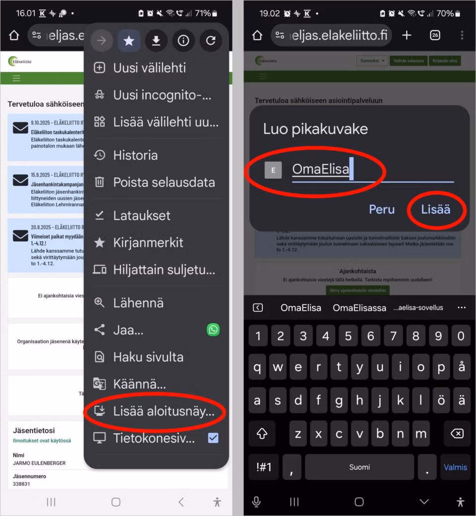 Näin asennat OmaEljaksen pikakuvakkeen puhelimen tai tabletin aloitusnäyttöön