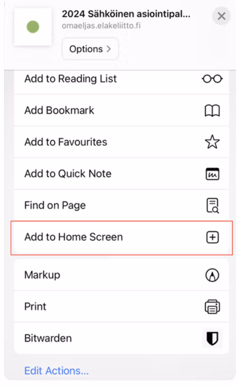 Valitse ponnahdusvalikosta ”Lisää aloitusnäyttöön” (tai ”Add to Home Screen”).