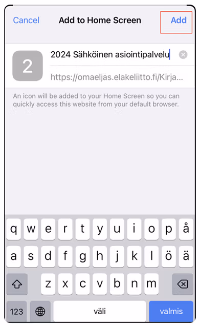 Nimeä pikakuvake esim. OmaEljas ja paina lopuksi ”Lisää” (tai ”Add”)-painiketta. Kuvake löytyy nyt puhelimen aloitusnäytöltä.